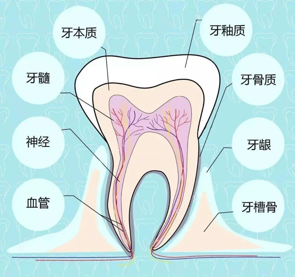 我们先看牙齿的构造,如图:1.最表面的是我们看得见的釉质层(牙釉质也是我们人体最为坚硬的组织);2.接下来是牙本质层,它是在釉质层里面,质地稍软,包裹着髓腔一圈,保护着牙髓神经;3.而中间还有一个空间,布满了血管、神经,就是牙髓组织。