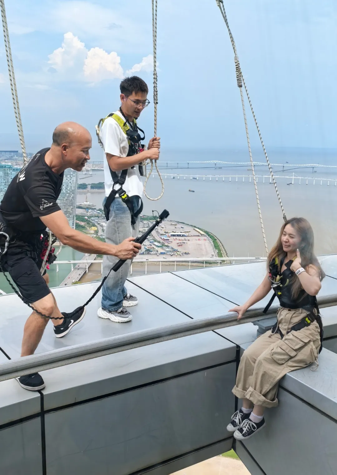 站在澳门旅游塔 233 米的观景台,整座城市的繁华与独特风光尽收眼底,胆大的伙伴挑战了空中漫步,尖叫声里藏着畅快。远处新旧建筑交融,城市天际线在眼前铺展,海河蜿蜒穿过,壮阔与灵动在此刻完美交融。