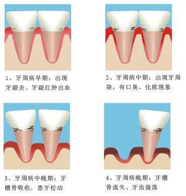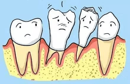 重度牙周炎。牙周病的最后阶段,支持牙齿的纤维与骨头会完全毁坏,而可能导致牙齿移位或松动;这会影响咀嚼功能,若积极治疗也无法挽回,就能需要将牙齿拔掉。